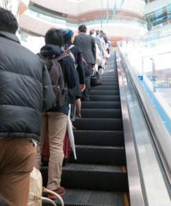 The Mistake: Blocking the flow of people by standing in the middle or on the “walking” side.